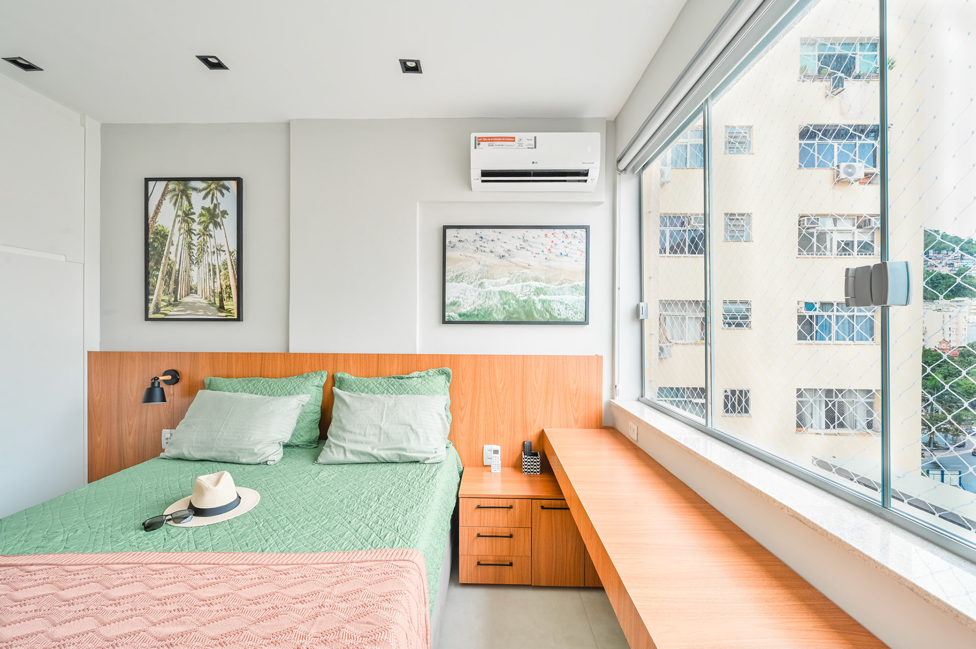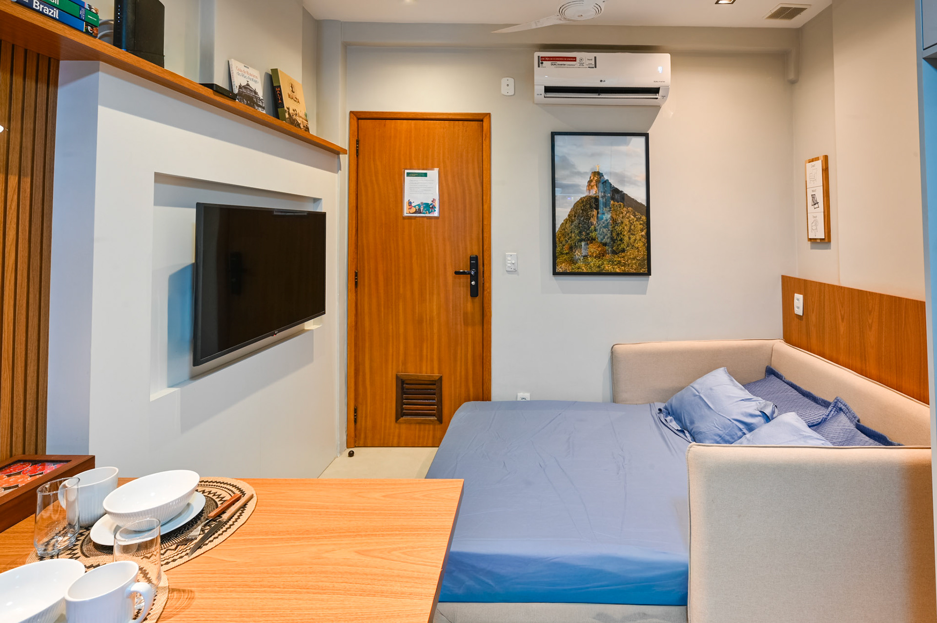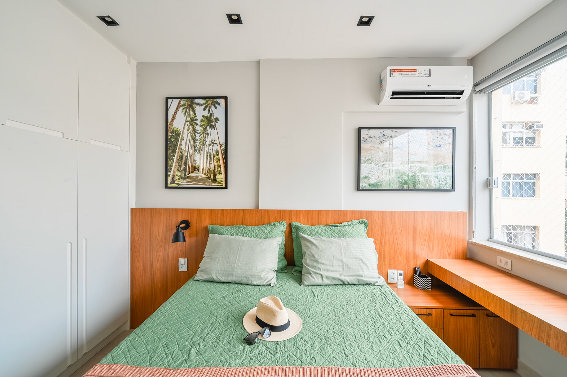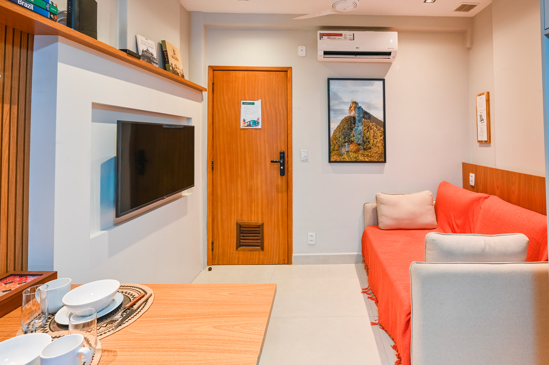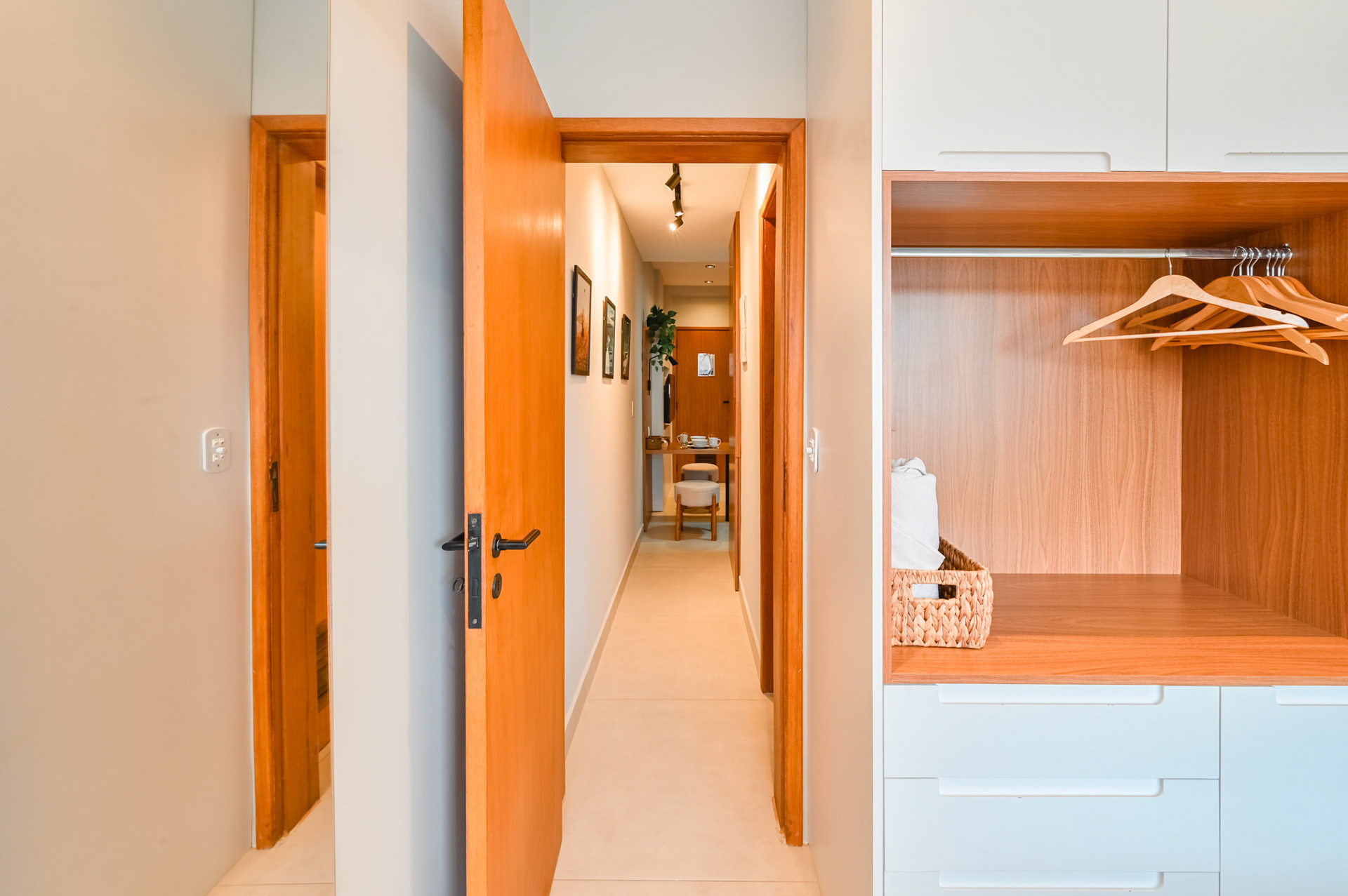 Ensaio fotográfico de um apartamento compacto projetado para locação por temporada no Rio de Janeiro. Apesar da metragem reduzida, o espaço foi pensado para oferecer conforto, funcionalidade e uma experiência acolhedora ao hóspede. O projeto explora a combinação de madeira, tons quentes e frios e iluminação com spots direcionados, enquanto a marcenaria sob medida otimiza cada área do apartamento sem comprometer a estética. A fotografia buscou valorizar a luminosidade natural, a organização do layout e os detalhes que reforçam a identidade carioca do ambiente.